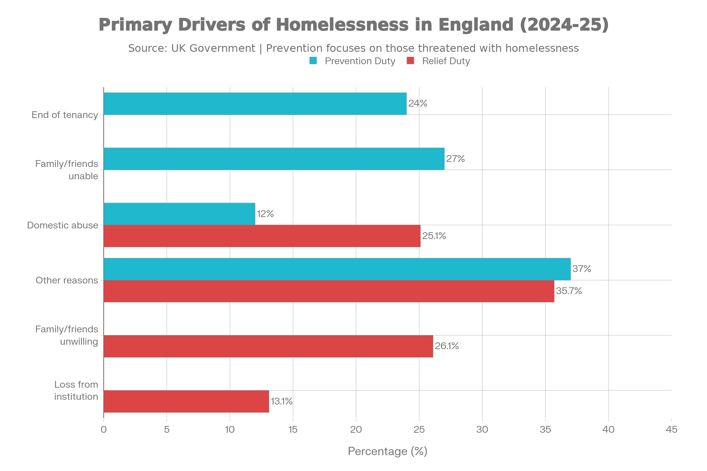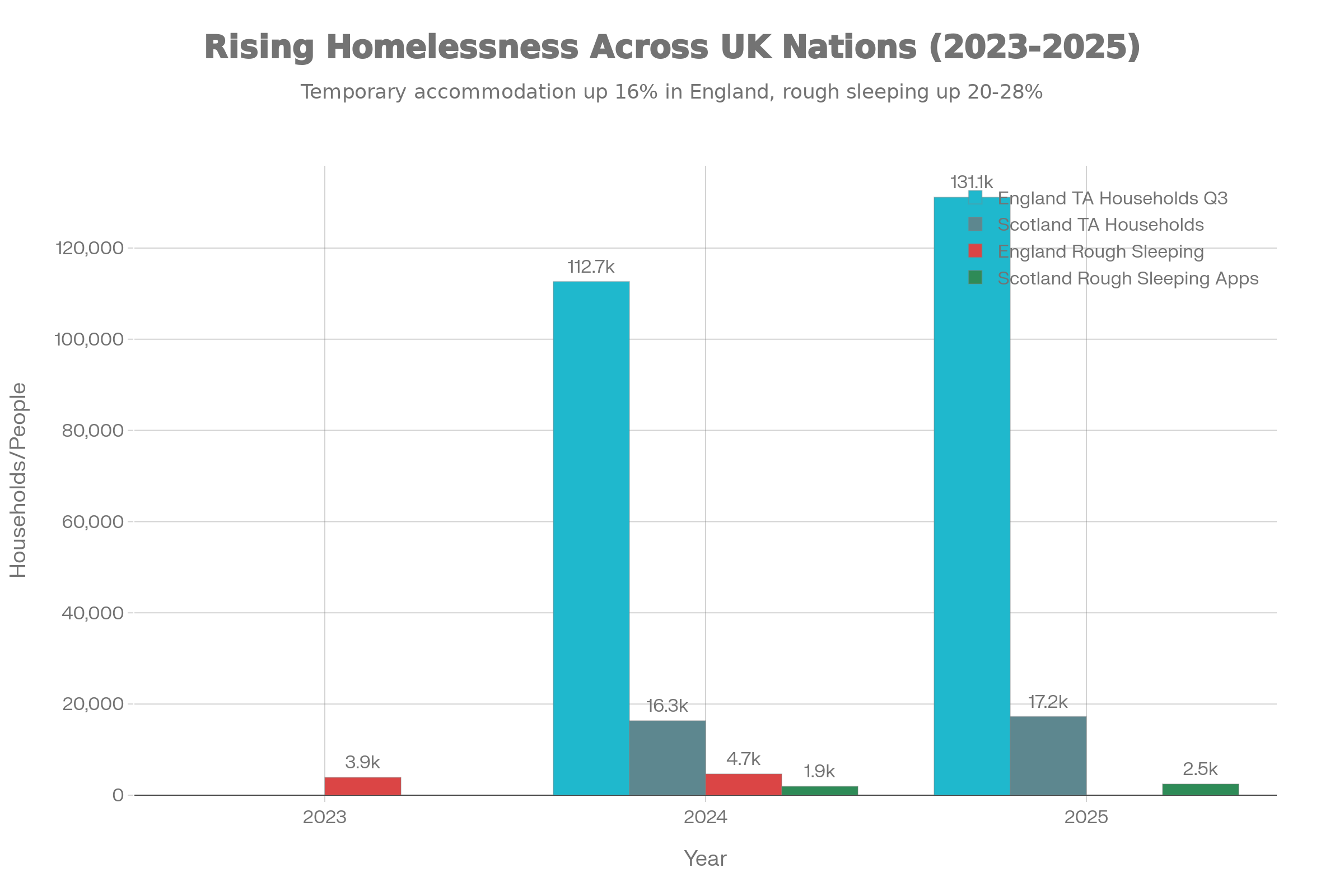 英国的无家可归危机涉及多层次的复杂因素。官方政府数据显示,这个问题既源于宏观经济和政策失败(住房短缺、福利冻结、私人租赁部门规制不足),也源于个人和社会脆弱性(精神健康、家庭暴力、社会孤立)。在2024-25年,流浪汉和无家可归者数量达到历史最高水平,尤其是对儿童的影响令人担忧,数十万儿童生活在不适当的临时住所中。政府官方评估认为,没有全面的跨部门战略和长期解决方案,这一危机将继续恶化。